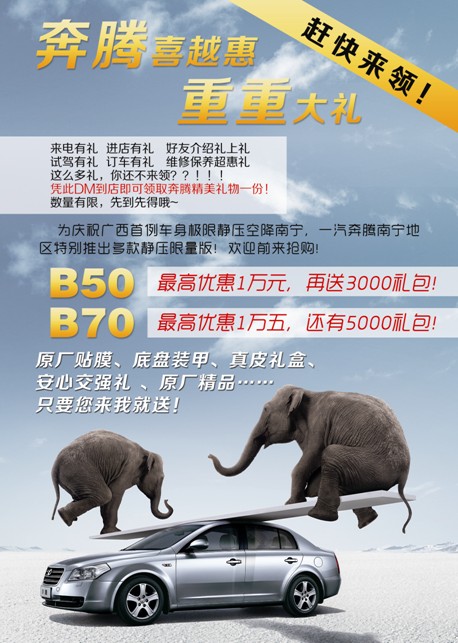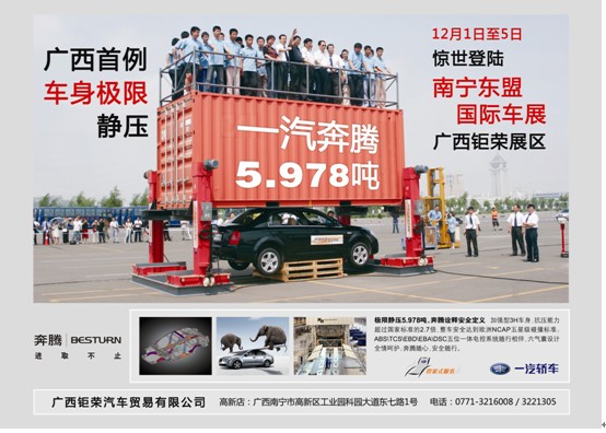 如此震撼的視覺盛宴您怎能錯過,活動期間購車更有超值豪禮大派送!詳情咨詢:0771-3216008,或在12月1日-5日蒞臨南寧國際會展中心外場廣西鉅榮一汽奔騰展區(qū)!