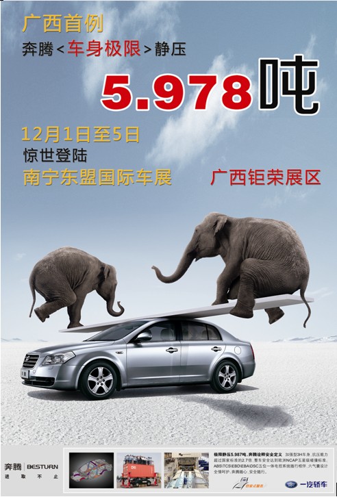 奔騰轎車高強度鋼架通過歐洲NCAP安全測試達到五星,其頂部可直接承受極限靜壓測試5.987噸,就算車上有兩頭大象朋友也不怕啦。