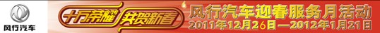 十萬榮耀共鑄輝煌,慶祝風行汽車年銷量突破十萬輛,為答謝廣大客戶對風行汽車的厚愛,并為客戶在寒冷冬季安全出行,過好新年, 我司定于2011年12月26日—2012年1月21日期間在全國風行汽車特約服務(wù)站內(nèi)開展“十萬榮耀 共賀新春”2012年風行汽車迎春服務(wù)月活動。