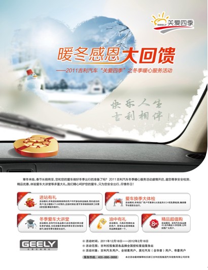 寒冬來(lái)臨,春節(jié)長(zhǎng)假將至,您和您的愛(ài)車(chē)做好冬季出行的準(zhǔn)備了嗎?2011吉利汽車(chē)冬季暖心服務(wù)活動(dòng)盛情開(kāi)啟,邀您尊享安全檢測(cè)、精品優(yōu)惠,體驗(yàn)愛(ài)車(chē)大講堂等多重大禮。我們精心呵護(hù)您的愛(ài)車(chē),只為您安全出行,盡情冬日!