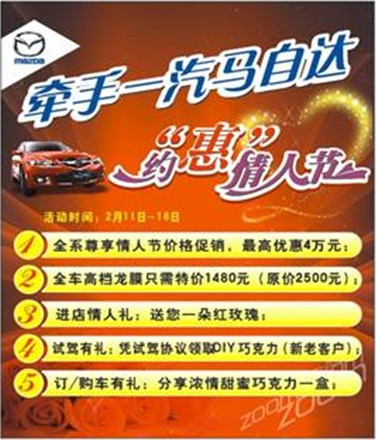 車有價(jià),愛無價(jià),浪漫情人節(jié),情牽一汽馬自達(dá),共同體驗(yàn)駕乘之愛,甜蜜之旅。鑫廣達(dá)一汽馬自達(dá)4S店全體員工預(yù)祝全天下的有情人終成眷屬!