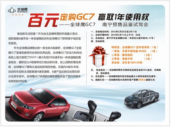 據(jù)悉,這款車已在2月1日到達南寧開河全球鷹4S店,從現(xiàn)在開始,你只要前往開河全球鷹南寧安吉、金源、白沙、北海等銷售網(wǎng)點,不僅可以賞析這款新車,更可以報名參與品鑒試駕會,憑百元定金參與贏取新車免費使用權(quán)活動,活動現(xiàn)場除新車使用權(quán)還有千元時尚禮品IPAD2、數(shù)碼相機、智能手機等著你來拿!我們將在3月11日南寧區(qū)域品鑒試駕會現(xiàn)場將揭曉幸運兒。