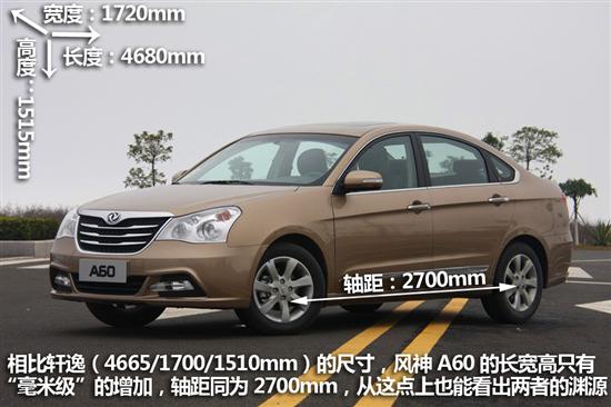A60借鑒了日產(chǎn)軒逸的平臺,長寬高分別為4680/1720/1515mm,相比軒逸(4665/1700/1510mm)的尺寸,風神A60的可以說只有“毫米級”的增加,而軸距同為2700mm。