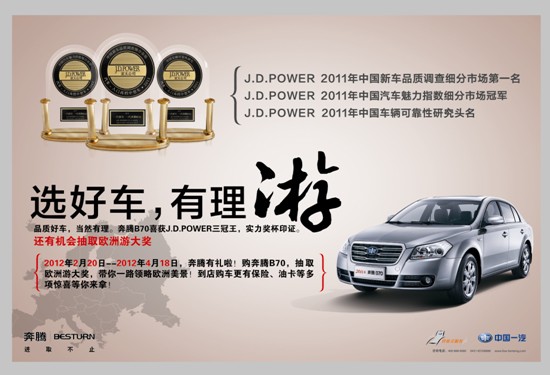 經(jīng)了解,奔騰B70喜獲2011年J.D POWER 中國新車品質(zhì)調(diào)查細分市場第一名!J.D POWER 汽車魅力指數(shù)細分市場冠軍!J.D POWER 中國車輛可靠性研究頭名!除了本次在2011年中國新車品質(zhì)調(diào)查中獲得細分市場第一,奔騰在J.D. Power榜單上頻頻獲獎,已然是J.D. Power的常客。在去年夏天公布的J.D. Power亞太公司近期公布的2011年中國汽車銷售滿意度研究(SSI)總體排名中,一汽奔騰成為了唯一一個高于行業(yè)平均值的自主品牌企業(yè),位居自主品牌第一名。同時,J.D Power中國售后服務(wù)滿意度指數(shù)研究(CSI)中,一汽奔騰也獲得超出行業(yè)平均值的好成績。而在去年,一汽奔騰旗下的重磅車型奔騰B70,更曾榮膺J.D. Power2010年度中國新車質(zhì)量和汽車魅力指數(shù)該級別細分市場的雙冠王。