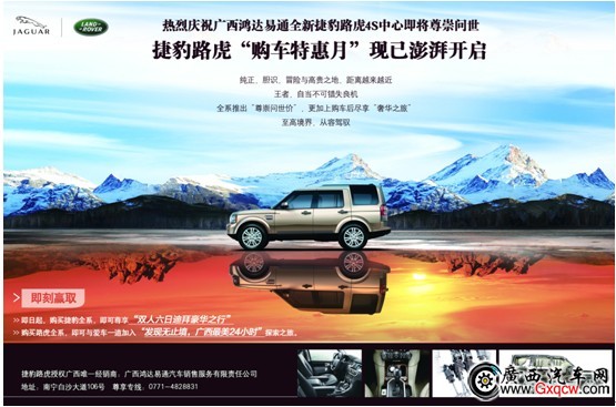 喜迎4S中心落成開業(yè),廣西鴻達(dá)易通從即日起至3月31日舉行捷豹路虎“購車特惠月”活動。