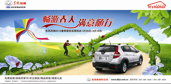 春暖花開,萬(wàn)物復(fù)蘇,東風(fēng)風(fēng)神春季服務(wù)關(guān)懷行動(dòng)也即將拉開帷幕。為了讓廣大用戶朋友更好地使用愛車、享受“品質(zhì)生活”,3月25日至4月10日期間,東風(fēng)風(fēng)神將在全國(guó)范圍內(nèi)開展春季服務(wù)關(guān)懷行動(dòng),為用戶送去6大暖春關(guān)懷服務(wù)。服務(wù)內(nèi)容不僅包括季節(jié)性車輛26項(xiàng)免費(fèi)檢測(cè)服務(wù)、免費(fèi)車主講堂等精誠(chéng)服務(wù),更專門設(shè)計(jì)了繽紛風(fēng)箏節(jié)親子互動(dòng)活動(dòng),為用戶提供“滿意到家”的服務(wù)。