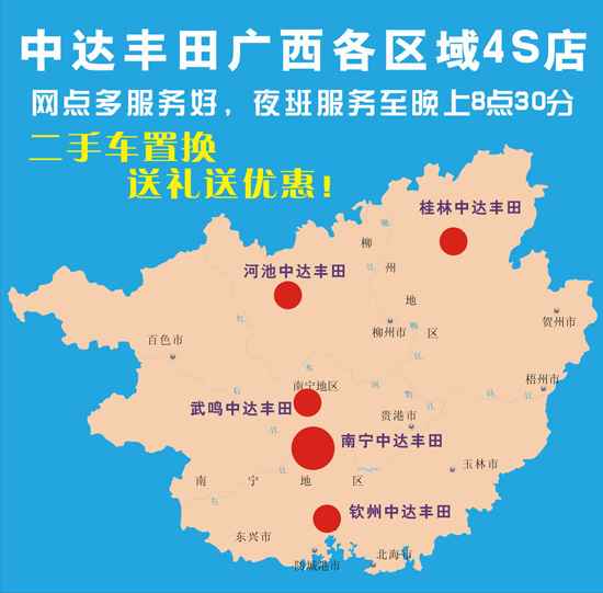 網(wǎng)點(diǎn)多服務(wù)好,十一年老店值得信賴(lài)!買(mǎi)車(chē)、售后服務(wù)就到金牌店南寧中達(dá)豐田,放心。