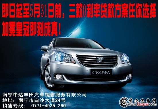 豪華座駕離你多遠(yuǎn)?白沙大道南寧中達(dá)豐田皇冠0利率精英專(zhuān)案現(xiàn)已啟動(dòng),即日起至5月31日前,三款0利率貸款方案任你選擇,加冕皇冠即刻成真!南寧中達(dá)豐田春光禮享季同時(shí)展開(kāi):即日起至4月30日。到店試駕銳志、卡羅拉、RAV4即可獲贈(zèng)iPhone4手機(jī)殼等時(shí)尚數(shù)碼試駕禮,購(gòu)銳志、卡羅拉、RAV4更有平板電腦、相機(jī)等價(jià)值2000元禮品。詳詢(xún):0771-4925260