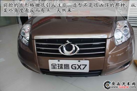 外觀造型來說,GX7以肌肉感十足的線條顯現(xiàn)出了歐美車的霸氣,這點(diǎn)在車頭造型中的多邊形前大燈、寸尺巨大的矩形進(jìn)氣格柵、放大效果的全球鷹logo中表現(xiàn)比較明顯。