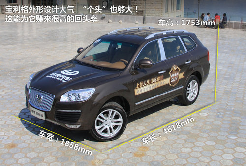 華泰寶利格是借鑒了老款保時捷卡宴的設計,并融入了其品牌的風格,如果用幾個詞來形容就是:大氣、優(yōu)雅、時尚。但是這樣的設計您能不能接受,那就是“仁者見仁智者見智了”但其在路上的回頭率還是很高的。寶利格的車身尺寸為:4618mm×1858mm×1753mm,軸距為2620mm。雖然在參數(shù)上沒有什么亮點,但是其視覺效果與后排空間絕對是要超過這些枯燥的數(shù)字帶給你的感覺。