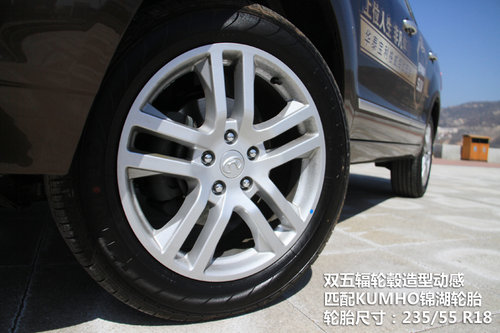 試駕的這款車型為寶利格的低配版,雖然是低配版也配置了動感十足的運動型鋁合金輪轂,與之匹配的是錦湖235/55R18輪胎,應(yīng)該說至少在尺寸上不輸于競品,但是其抓地性一般。