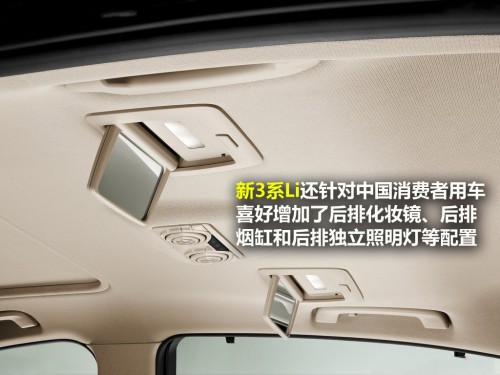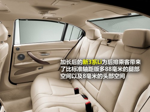 既然是加長(zhǎng)版車型,新3系Li的后排空間表現(xiàn)自然是消費(fèi)者最為關(guān)注的地方。從已知的數(shù)據(jù)可以了解到,加長(zhǎng)后的新3系Li為后排乘客帶來(lái)了比標(biāo)準(zhǔn)軸距版多88毫米的腿部空間以及8毫米的頭部空間,提供給后排乘客一個(gè)更大、更舒適的乘坐空間。同時(shí),新3系Li還針對(duì)中國(guó)消費(fèi)者用車喜好增加了后排化妝鏡、后排煙缸和后排獨(dú)立照明燈等配置,支持40:20:40三段式比例放倒的后排座椅也可以用來(lái)滿足空間需求的多樣性和便利性。