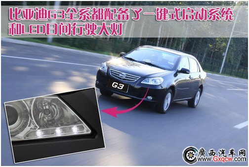 比亞迪G3全系車型都配備了一鍵式啟動系統(tǒng),在這一級別的產(chǎn)品中非常少見。另外,比亞迪G3還配備了LED日間行駛大燈,不僅看上去非常漂亮,也給行車帶來更多的安全保障。比亞迪G3整車尺寸比F3要大,而且內(nèi)部空間也變得更加充裕,提高了整車駕乘舒適感受。