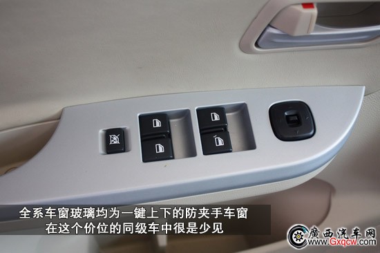 新福美來全系車窗玻璃均為一鍵上下的防夾手車窗,在這個(gè)價(jià)位的同級(jí)車中很是少見。車門內(nèi)的儲(chǔ)物格基本夠用,高配車型還集成外后視鏡電動(dòng)折疊功能。