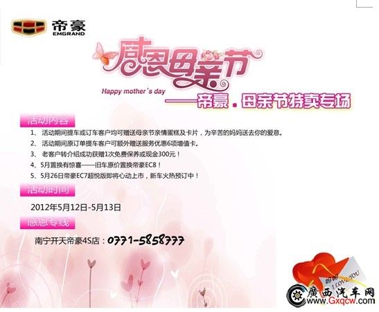 1、 活動期間提車或訂車客戶均可贈送母親節(jié)親情蛋糕及卡片,為辛苦的媽媽送去你的愛意。