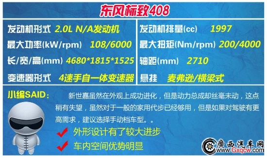 至于動力方面,1.6L和2.0L兩個老搭檔依舊是主力,不過2.0L換裝了新的氣門正時結(jié)構(gòu),廠家解釋是帶自動除積碳功能的金屬節(jié)氣門,并且還對進氣歧管進行了優(yōu)化,看樣子,2.0L車主在日后的維修費用上可以有所減少。傳動系統(tǒng)依舊是老款的五速手動和四速自動變速箱,這一點有些拖了408的后腿。