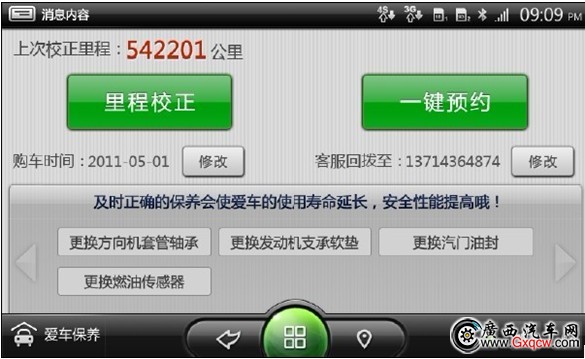 車友互聯(lián)愛車保養(yǎng)功能,根據(jù)不同車型設(shè)定專業(yè)保養(yǎng)計(jì)劃,并根據(jù)您校正的里程數(shù),GPS終端、網(wǎng)站同步為您提供精準(zhǔn)的保養(yǎng)提醒服務(wù);當(dāng)您收到系統(tǒng)的保養(yǎng)提醒是,可進(jìn)行保養(yǎng)預(yù)約,4S店與您溝通,提前做好保養(yǎng)準(zhǔn)備,并且系統(tǒng)會下發(fā)商戶的位置信息,您可直接導(dǎo)航前往,保養(yǎng)愛車更方便。