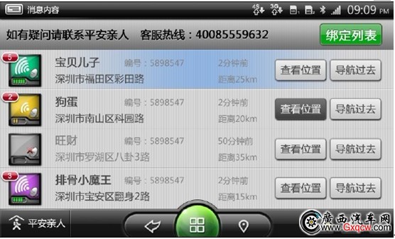 平安親人通過采用GPS與手機(jī)通訊技術(shù)相結(jié)合的個(gè)人追蹤器產(chǎn)品為私家車主提供對孩子、老人、愛犬的追蹤服務(wù),用戶可以通過裝有車友互聯(lián)智能導(dǎo)航系統(tǒng)的機(jī)器實(shí)時(shí)看到他們的位置并動態(tài)導(dǎo)航至親人所在地點(diǎn),全天候保護(hù)親人安全。