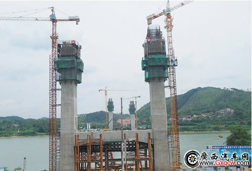 大沖邕江特大橋水中的8號(hào)、9號(hào)墩索塔已建至約60米高