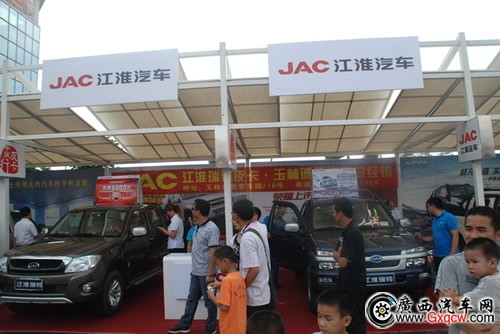 江淮汽車展位前人氣不斷,客戶進(jìn)入瑞鈴皮卡車內(nèi)感受