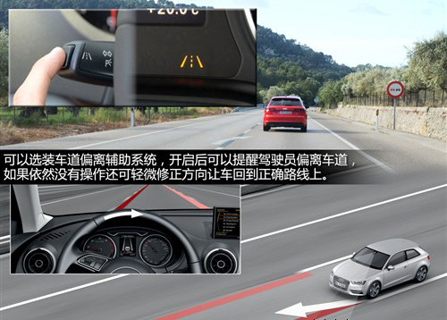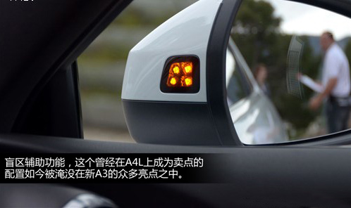 ACC自適應(yīng)巡航系統(tǒng)、盲區(qū)輔助系統(tǒng)、車道偏離提示系統(tǒng)、自動泊車系統(tǒng)、全景倒車影響系統(tǒng)。雖然這些功能并不陌生,在很多國內(nèi)銷售的車型中都有裝配,但集中在一款緊湊型車上還是讓人很有滿足感的。值得一提的是A3還配備了比較少見的膝部氣囊。