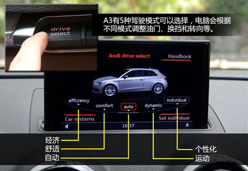 通過MMI系統(tǒng)可以將駕駛模式在舒適、自動、運動、經(jīng)濟(jì)和個性化五種方案間切換,電腦會根據(jù)不同模式自動調(diào)整油門踏板靈敏度、轉(zhuǎn)向助力的力度,如果是S tronic 7速雙離合變速箱還將調(diào)整換擋時機(jī)。在經(jīng)濟(jì)模式下,電腦還會控制空調(diào)系統(tǒng)、ACC自適應(yīng)巡航系統(tǒng)甚至是大燈全部以最經(jīng)濟(jì)的方式運行。