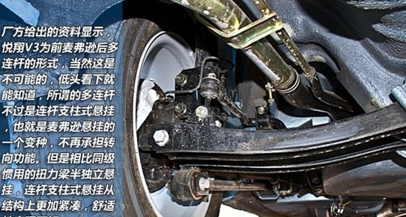 其次是舒適性,這是這款車型必須具備的特質(zhì)。我們可以從懸掛機構(gòu)上看出一些端倪,廠方給出的資料顯示,悅翔V3為前麥弗遜后多連桿的形式,當(dāng)然這是不可能的,低頭看下就能知道,所謂的多連桿不過是連桿支柱式懸掛,也就是麥弗遜懸掛的一個變種,不再承擔(dān)轉(zhuǎn)向功能。但是相比同級慣用的扭力梁半獨立懸掛,連桿支柱式懸掛從結(jié)構(gòu)上更加緊湊,舒適性表現(xiàn)更好。