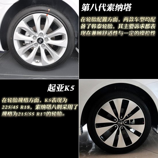 在輪胎配置方面,兩款車型均配備了韓泰輪胎,其主要訴求都表現(xiàn)在兼顧舒適性與一定的操控性。在輪胎規(guī)格方面,K5表現(xiàn)為225/45 R18,索納塔八則采用了規(guī)格為215/55 R17的輪胎。