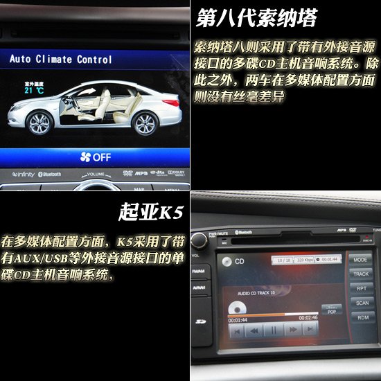 在多媒體配置方面,K5采用了帶有AUX/USB等外接音源接口的單碟CD主機(jī)音響系統(tǒng),而索納塔八則采用了帶有外接音源接口的多碟CD主機(jī)音響系統(tǒng)。除此之外,兩車在多媒體配置方面則沒(méi)有絲毫差異。