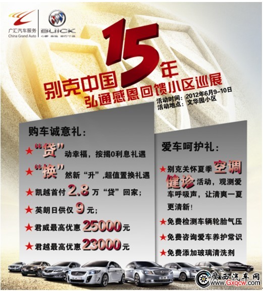 據(jù)悉,安吉弘通別克4S店將在6-8月開展“別克中國15年巡展服務(wù)活動”,該活動持續(xù)3個月,主要在西鄉(xiāng)塘重點小區(qū)開展,活動主要有車輛免費檢測,保養(yǎng)知識咨詢,空調(diào)診斷,新車展示,愛車免費評估,以舊換新等。