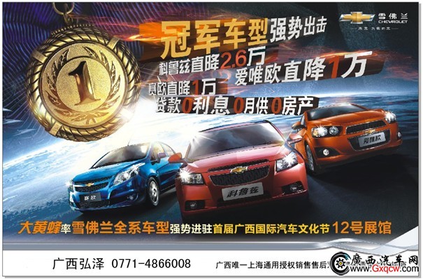 2012年6月15至18日廣西國(guó)際汽車文化節(jié)將在南寧國(guó)際會(huì)展中心隆重舉行。本次車展弘澤雪佛蘭科魯茲冠軍版、愛維歐冠軍版、新賽歐冠軍版強(qiáng)勢(shì)出擊,最高鉅惠30000元。送豪華特選禮包+1年重要部件延保。弘澤雪佛蘭所在南寧國(guó)際會(huì)展中心12號(hào)展館等候車友們前來賞車購(gòu)車,并且現(xiàn)場(chǎng)有冷飲,水果和甜點(diǎn)提供。