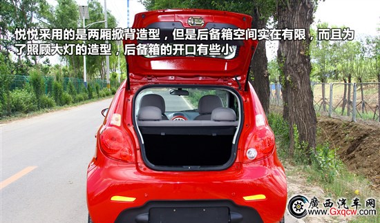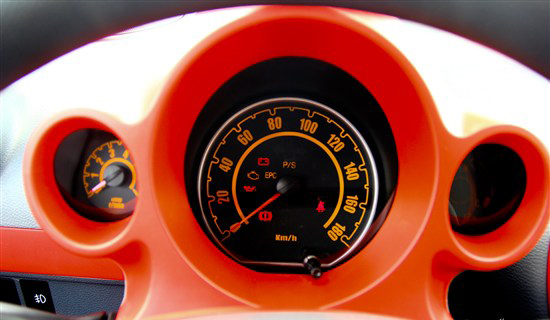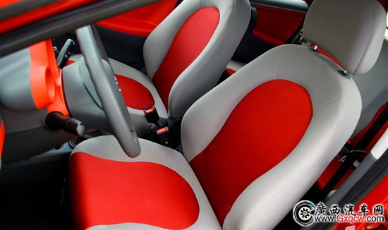 座椅也很配合的采用了紅灰配色,織物座椅做起來很舒適,前排座椅的包裹性很好,乘坐感受不錯(cuò),不過由于2390mm的軸距有限,又要照顧后面的后備箱空間,加上后排座椅靠背調(diào)節(jié)的比較直,所以后排的乘坐感受很一般?紤]到由于微型車的適用人群都是戀愛期的小兩口,所以后排空間不足的毛病也就忍了,等婚后家庭成員增加的時(shí)候再換大車吧!