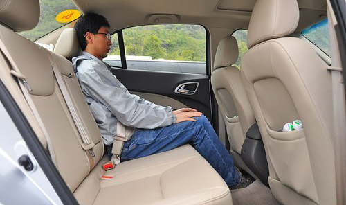 腿部空間較寬裕,頭部空間稍緊湊而和廠家人員交流后得知,空間方面在設(shè)計(jì)時(shí)也進(jìn)行了一番權(quán)衡。出于優(yōu)先考慮后排腿部空間的出發(fā)點(diǎn),后排座椅位置選擇了相對(duì)整體后移了一些,并且后排坐墊也采用了相對(duì)較短的設(shè)計(jì)(好在我在幾十分鐘的短途乘坐過(guò)程中并未發(fā)覺(jué)不適),以便騰出更多的腿部伸展空間。