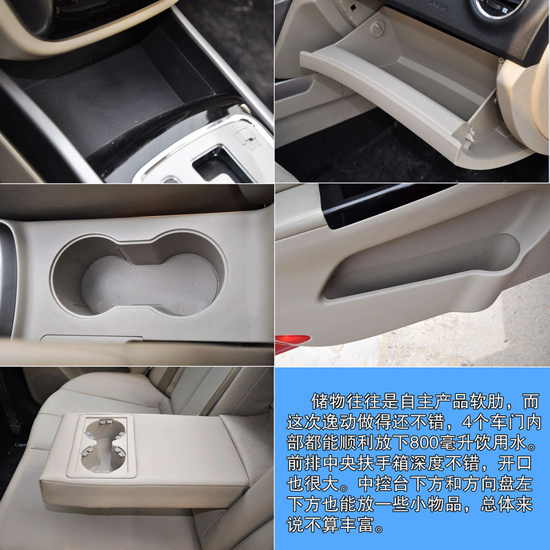 儲物往往是自主產(chǎn)品軟肋,而這次逸動做得還不錯,4個車門內(nèi)部都能順利放下800毫升飲用水。前排中央扶手箱深度不錯,開口也很大。中控臺下方和方向盤左下方也能放一些小物品,總體來說不算豐富。尤其要表揚(yáng)一下逸動的導(dǎo)航和娛樂系統(tǒng),樣式有點(diǎn)像天籟,既方便操作,同時也避免了陽光對視線的影響。而510升后行李廂表現(xiàn)也不錯,內(nèi)部平整,5個人的隨身行李放進(jìn)去都是沒有問題的。