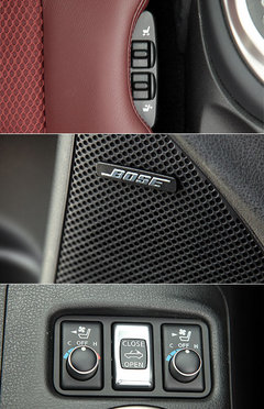 雖然定位為性能跑車(chē),然而370Z Roadster在配置上仍具有一定的水平。中控臺(tái)上的7吋彩色觸控屏幕,整合衛(wèi)星導(dǎo)航、恒溫空調(diào)、CD音響、藍(lán)牙通訊、車(chē)輛信息等多樣化功能,并提供全中文化界面,操作起來(lái)更加便利易懂。特別就音響系統(tǒng)部份,370Z Roadster除了支持CD、DVD、i-Pod、USB、AUX-IN等多媒體外,本身也內(nèi)建9.3 GB Music Box硬盤(pán),再搭配音響大廠Bose提供的8具揚(yáng)聲器組合,可大幅擴(kuò)充車(chē)上娛樂(lè)機(jī)能。