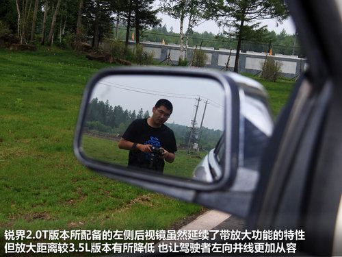 通過之前試駕銳界3.5L版本,這樣三個設(shè)計給我留下了很深刻的“印象”,首先是左側(cè)外后視鏡,美國車很喜歡將左側(cè)的后視鏡設(shè)計為放大效果,這樣的設(shè)計在美國可能很實用,但是并不符合中國國情,駕駛者往往很難分辨左側(cè)車輛與自己的距離,以致不敢并線。所以在上車之前,我就首先查看了一下這項配置是否仍舊存在,雖然它的視覺效果與右側(cè)后視鏡仍舊有些不同,但也已經(jīng)不會再影響駕駛。