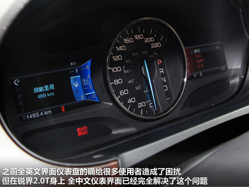 另外一個并不完美的地方,就是儀表盤上所配備的全英文顯示界面,由于銳界的儀表盤可控功能很多,所以這里的使用率很大。全英文界面的確為我們的用車生活帶來了很大的不便,但福特銳界2.0L EcoBoost對這個弊端同樣做出了改進,之前的全英文界面已經(jīng)不復(fù)存在,取而代之的是更為簡潔易懂,卻又不喪失原有科技感的中文界面。
