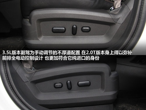 在之前試駕過的3.5L版本身上,我們曾經(jīng)意外的發(fā)現(xiàn)了一項很不厚道的配置,那便是副駕座椅為手動調(diào)節(jié),這樣的設(shè)計并不符合這款純進口SUV40萬左右的售價。在2.0T版本身上,這項配置得以彌補,也為使用者提供了更大的便利。