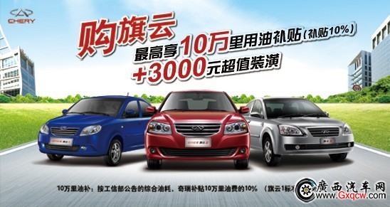 其中,購旗云全系(旗云1、2、3)可均享受10萬里油補(bǔ)貼;購2012款旗云2除了可獲得10萬里油補(bǔ)外,還能享受3000元優(yōu)惠大禮。