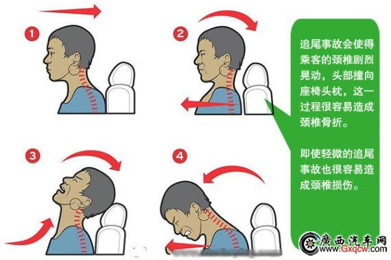 1、防止追尾撞擊事故中的頸椎傷害,關(guān)鍵在于發(fā)生撞擊事故時讓乘員的頭部和上身一起和諧地運(yùn)動。測試表明在座椅頭枕有足夠的高度,身體、頭部都有效接觸座椅及頭枕情況下,碰撞給車帶來的加速度,將通過座椅靠背及頭枕同時傳遞給身體和頭部,從而有效降低碰撞時對頸椎的傷害。換句話說,乘車過程中我們要盡量保持整個身體(包括頭部)與座椅的充分接觸。