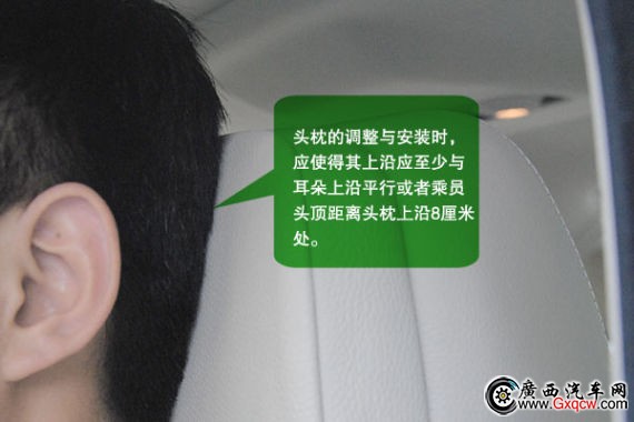 3、頭枕應(yīng)安裝在至少與耳朵上沿平行的地方或者乘員頭下約8.89厘米的地方。頭枕調(diào)整完畢后,牢牢固定頭枕,使頭枕不晃動。