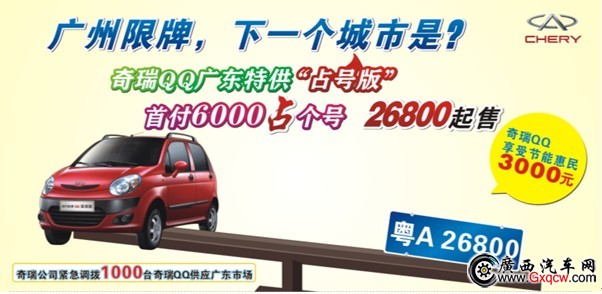 針對廣州限牌問題,記者有幸電話采訪了奇瑞銷售公司總經(jīng)理鄭兆瑞先生,鄭總詳細闡述了在當(dāng)前形勢下奇瑞公司如何面對廣州限牌的一些列措施。鄭總表示:“3小時的反映時間對我們來說確實少了點,本次廣州限牌QQ車為何能銷售一空?總結(jié)分析很簡單,奇瑞QQ是奇瑞公司最成熟的精品小車,2012款QQ更是經(jīng)過多項升級,性能穩(wěn)定,油耗低,最低百公里油耗3.05升,維修保養(yǎng)成本低,同時還享受國家節(jié)能惠民補貼3000元。為滿足廣東市場需求,奇瑞公司在聽聞廣州限牌后緊急調(diào)撥1000臺廣東省特供“占號版”QQ供應(yīng)廣東市場。特供“占號版”QQ市場售價26800元起,辦理金融貸款首付6000元即可開回家,只要花6000元就能先占個號!