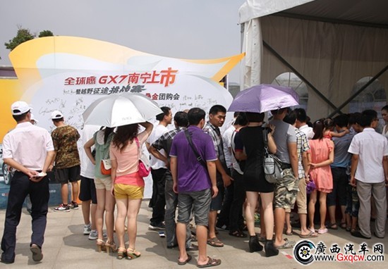 7月22日,節(jié)氣中的大暑,在這個(gè)非常的日子里,吉利自收購(gòu)沃爾沃后推出的首款SUV-全球鷹GX7于廣西體育中心首發(fā)上市暨越野征途挑戰(zhàn)賽——吉利全系疊金團(tuán)購(gòu)會(huì)盛大開(kāi)啟;顒(dòng)當(dāng)天將近500批客戶積極參與,現(xiàn)場(chǎng)激情澎湃的上市儀式,熱鬧非凡的疊金團(tuán)購(gòu)會(huì),精彩刺激的挑戰(zhàn)賽等精彩活動(dòng)內(nèi)容,一次次引爆全場(chǎng)客戶的熱情。更有930電臺(tái)知名主持人坐鎮(zhèn)現(xiàn)場(chǎng)幫客戶疊金,在下午天氣最熱的時(shí)候同時(shí)也將全場(chǎng)疊金活動(dòng)推到最高潮。