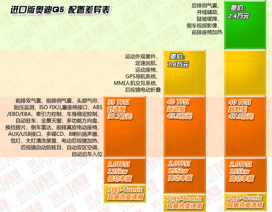 多掏7.8萬元,除了可以將最大功從125kW提升至155kW,扭矩從280Nm提升至300Nm。我們再看看看配置上有怎樣的變化。安全配置依然沒有任何變化,只是輪轂尺寸提升至18寸,視覺效果更加突出。而舒適性配置則增加了:運動外觀套件、定速巡航、運動座椅、GPS導(dǎo)航系統(tǒng)、MMI人機交互系統(tǒng)、后視鏡電動折疊等,整體價值基本達到7.8萬元的水平,喜歡高配的朋友值得推薦。