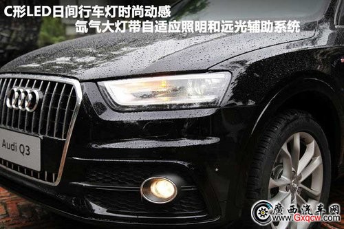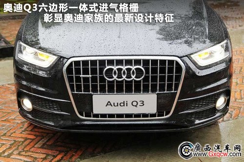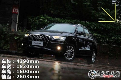 奧迪Q3的長、寬、高分別為4390mm、1830mm和1600mm,軸距為2603mm,跟進口途觀大小相仿,而它與大家認為的競爭對手寶馬X1(4469*1798*1583mm,軸距為2760mm)相比則要小了一圈。但奧迪Q3小巧流暢的車頂線條和明顯下沉的車尾造型,體現(xiàn)出特有的Coupé轎跑車動感風(fēng)格。