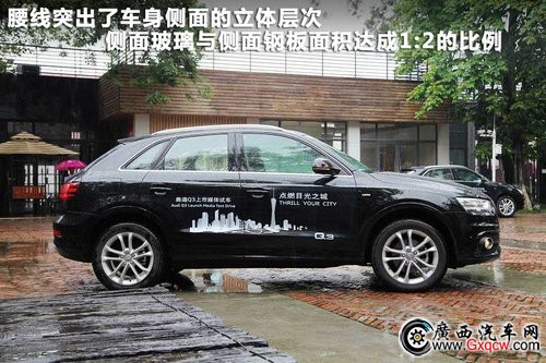 作為奧迪家族設(shè)計特征的“旋風(fēng)線”突出了車身側(cè)面的立體層次,與行李廂線條相連后形成了環(huán)繞車身四周的連貫線條,這使奧迪Q3不論是在靜態(tài)還是動態(tài)都表現(xiàn)出強烈的動感魅力。奧迪Q3的動感還體現(xiàn)在側(cè)面玻璃面積與側(cè)面車身鋼板面積的比例上,1:2的比例是奧迪經(jīng)典的家族設(shè)計特征。