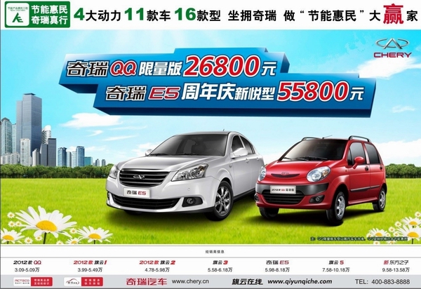 在越來越倡導環(huán)保的今天,奇瑞QQ以自身實力向我們證明實至名歸的傳奇。如今,正值各大城市限牌當道,誰是下一個廣州不得而知,F在購買奇瑞QQ,預防限牌,占號增值。有購車計劃的朋友,不妨趁機購入愛車,提早享受有車生活!