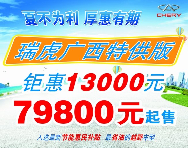 現(xiàn)在凡購買瑞虎廣西特供版(瑞虎2012款運動型),不僅可體驗瑞虎增配帶來的智能駕乘體驗,還可享受高達13000元的購車鉅惠,7.98萬元起售。