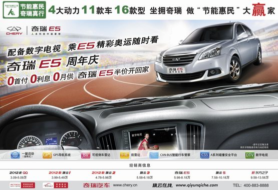 這個(gè)暑假讓奇瑞E5數(shù)字奧運(yùn)版帶你體驗(yàn)倫敦奧運(yùn),為祖國奧運(yùn)健兒吶喊助威。用激情點(diǎn)燃奧運(yùn),用優(yōu)惠的價(jià)格帶奇瑞E5數(shù)字奧運(yùn)版回家。你還在等什么呢?