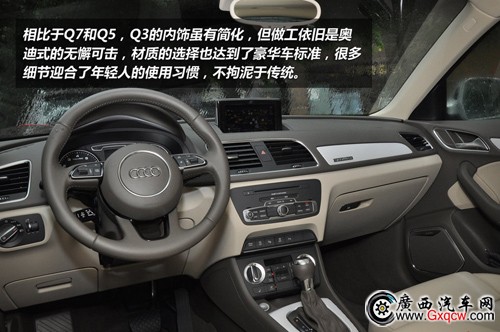 奧迪Q3的內(nèi)飾延續(xù)了奧迪以往的精致做工,整體布局吸取了奧迪Q5的部分元素,同時(shí)有些設(shè)計(jì)思路和奧迪A1也基本吻合。比如三幅式的運(yùn)動(dòng)方向盤(pán)、偏向駕駛員一側(cè)的中控臺(tái)。而且?jiàn)W迪Q3的內(nèi)部采用了大量了鍍鉻裝飾件,和三種內(nèi)飾配色之一的黑色相組合,會(huì)給人十足的運(yùn)動(dòng)感和時(shí)尚感。配置方面,Q3配備全景天窗、運(yùn)動(dòng)座椅、帶加熱功能的電動(dòng)調(diào)節(jié)座椅、無(wú)匙起動(dòng)系統(tǒng)、雙區(qū)自動(dòng)空調(diào)、有色后窗玻璃、三幅式真皮方向盤(pán)等舒適便利性裝備。安全方面,除了ESP車身穩(wěn)定控制系統(tǒng)外,奧迪Q3還有坡道輔助起步、下坡輔助和自動(dòng)控制下坡車速等系統(tǒng)。